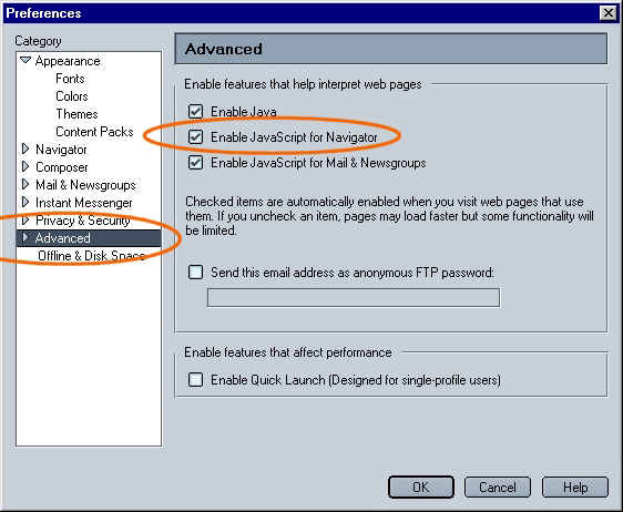 pane, make sure 'Enable JavaScript for Navigator' is checked.